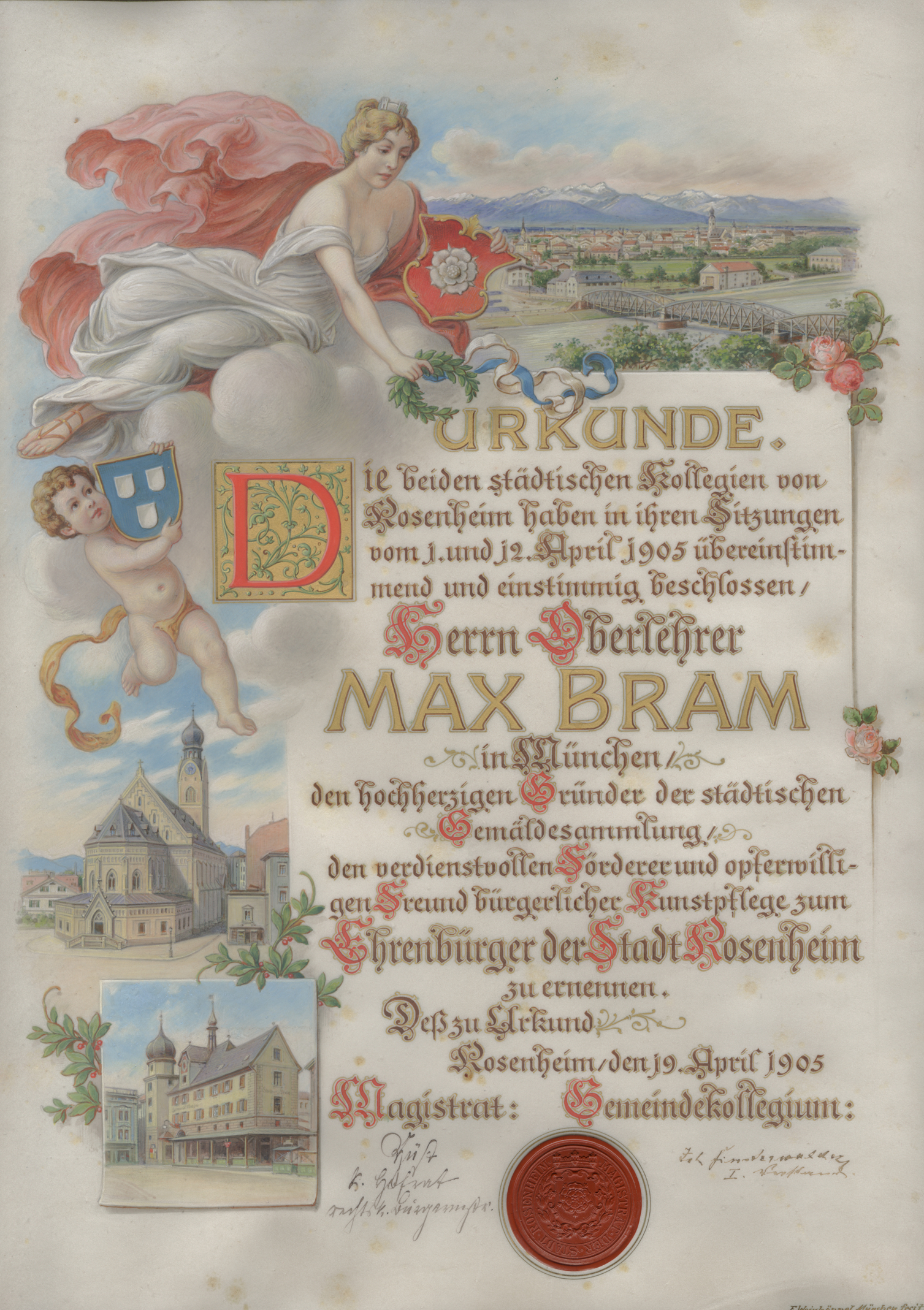 Der damalige rechtskundige Bürgermeister, Hofrat Josef Wüst, unterschrieb das Dokument: „Die beiden städtischen Kollegien von Rosenheim haben in ihren Sitzungen vom 1. und 12. April 1905 übereinstimmend und einstimmig beschlossen, Herrn Oberlehrer Max Bram in München, den hochherzigen Gründer der städtischen Gemäldesammlung, den verdienstvollen Förderer und opferwilligen Freund bürgerlicher Kunstpflege, zum Ehrenbürger der Stadt Rosenheim zu ernennen. Deß zur Urkund, Rosenheim, den 19. April 1905". Der Geehrte war am 23. Mai 1855 in Pfarrkirchen geboren. Aufgewachsen in Rosenheim, wohnte er in der Königstraße und besuchte die Präparandenschule im heutigen Rathaus.