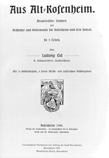 1906 erschien die vom Stadtarchivar Ludwig Eid erarbeitete Rosenheimer Chronik "Aus Alt-Rosenheim" in drei Teilen über die Landschaft, die Geschichte und die sozialen Strukturen von Rosenheim.