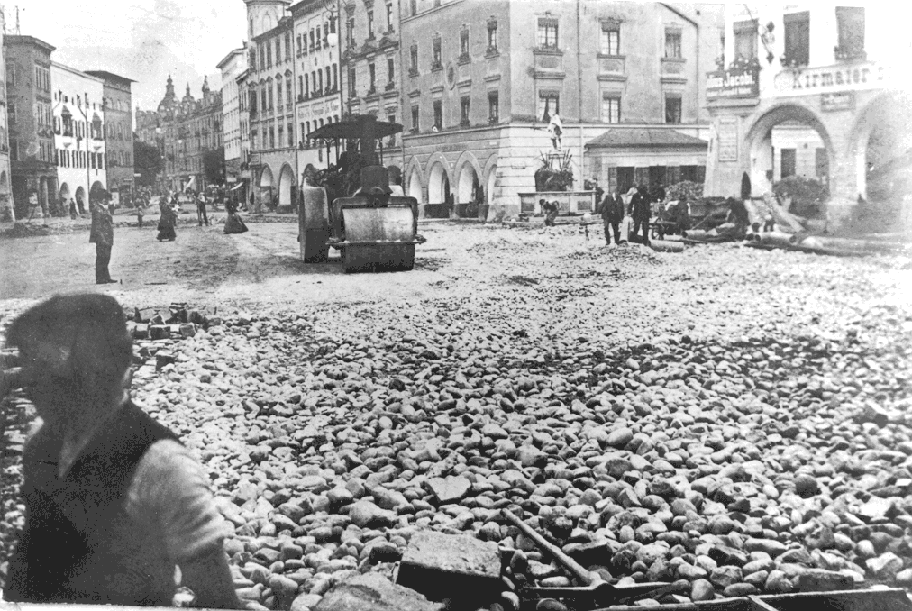 Als "vordringlich" erkannte der Magistrat 1908 die Neupflasterung des Max-Josef-Platzes an, kam es doch laufend zu Achsbrüchen der durchfahrenden Wagen. In mehreren Bauabschnitten wurde der neue Straßenbelag eingebaut.