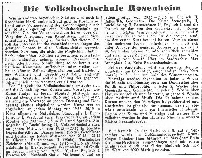 Bereits im Februar 1946 hatten die Gewerkschaften die Initiative ergriffen und für den Kreis Rosenheim mit der Durchführung von Arbeitsgemeinschaften begonnen. Diese Kurse, die werktags nach Feierabend abgehalten wurden, deckten insgesamt 9 Fächer ab, darunter Deutsch in Wort und Schrift, Literatur und Literaturgeschichte, Rechnen, Stenographie und die Fremdsprachen Englisch, Italienisch und Russisch. Die Teilnahme beschränkte sich dabei nicht nur auf Gewerkschaftsmitglieder; auch die nicht gewerkschaftlich organisierten Werktätigen konnten die Kurse besuchen, mußten dafür aber, anders als Gewerkschaftsangehörige, eine Kursgebühr von 3 Reichsmark entrichten.