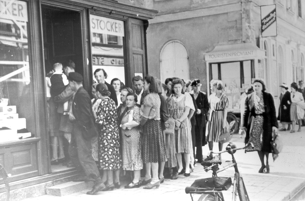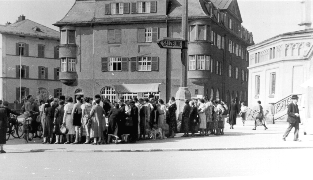 Das Foto scheint auf den ersten Blick eher nichtssagend und belanglos: eine Schlange wartender Kunden vor dem Tabakgeschäft von Franz Stocker in der Münchenerstraße 7. Der pensionierte Reichsbankrat Ernst Seiffert hatte diese Aufnahme zusammen mit einem Dutzend ähnlicher Bilder, die alle wartende Menschen vor Geschäften und den Verkaufsständen am Grünen Markt zeigen, im Kriegssommer 1941 gemacht.