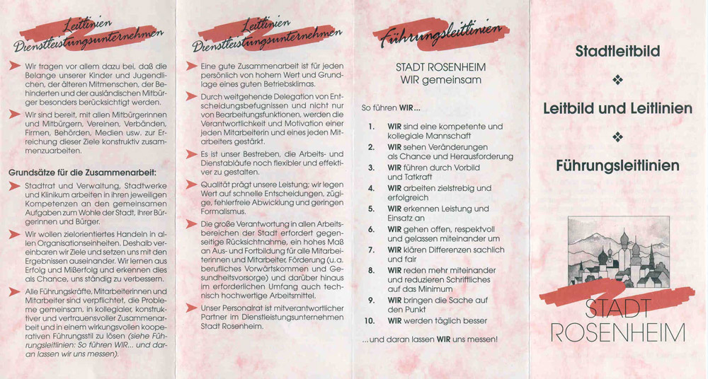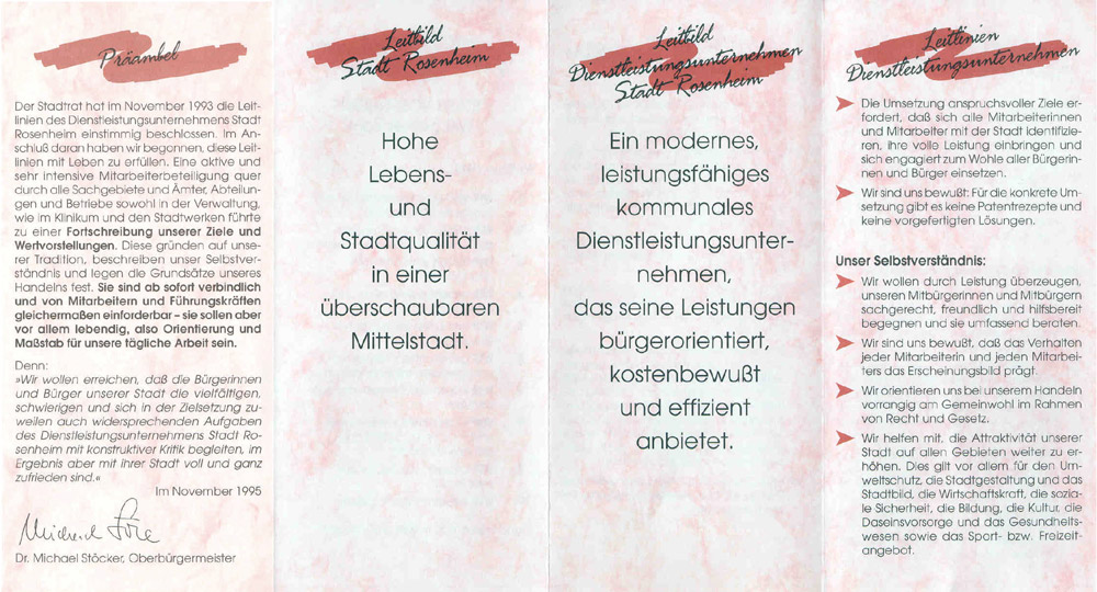 Das Leitbild "Stadtverwaltung als Dienstleister" sowie eine "liebens- und lebenswerte Mittelstadt mit Qualität statt Quantität" wurde im Herbst 1995 in einem Faltblatt der Öffentlichkeit vorgestellt. Darin wurde auch das neue Selbstverständnis der Verwaltung definiert. Durch Leistung überzeugen, am Gemeinwohl orientiert, die Belange von Kindern und Jugendlichen, Senioren, Behinderten und Ausländern besonders berücksichtigen, konstruktiv mit Bürgern und Vereinen, Firmen und Behörden zusammenarbeiten sind nur einige der aufgestellten Leitlinien.