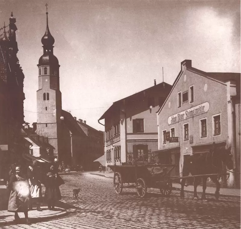 Die heutige Innstraße hatte früher verschiedene Namen. Vom Inn- oder Fleischbanktor bis zur Mangfallbrücke hieß sie Spitalgasse nach dem dort liegenden Armenspital. Das übrige Stück war Landstraße und mit „Straße nach Traunstein bzw. Salzburg" benannt. Für die Gebäude zwischen Mangfall- und Innbrücke war auch die Bezeichnung „an der Mangfallbrücke" üblich. Aber schon 1807 findet sich für den Straßenteil zwischen Ludwigsplatz und Bayerwiese der Name „Innstraße", den der Straßenzug allerdings erst 1882 in seiner ganzen Länge mit der Neubenennung der Rosenheimer Straßen erhielt. Rechts im Bild steht ein Pferdefuhrwerk vor dem 1883 gegründeten Steinmetzgeschäft von Johann Rösner.