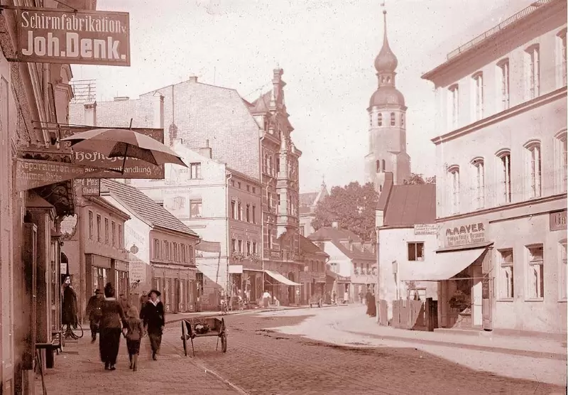 Das Kalenderbild entstand im Jahr 1914 und zeigt geschäftiges Treiben auf den Trottoirs der Innstraße. Im Hintergrund fällt der Blick auf die 1618/19 errichtete Spitalkirche St. Joseph. Nach dem großen Marktbrand von 1641 erhielt der Kirchturm seinen charakteristischen Zwiebelhelm. Zwar stammten die meisten Häuser des dargestellten Straßenabschnitts noch mit zwei Stockwerken und Schopfwalmdächern aus dem frühen 19. Jahrhundert, die großstädtische Architektur der Jahre um 1900 begann das Straßenbild aber bereits deutlich zu verändern. Diese Entwicklung zeigt beispielsweise die vierstöckige, reich gegliederte Front des 1899 errichteten Wohn- und Geschäftshauses des Hutgeschäftsinhabers Michael Neff in der Bildmitte. Ganz links fällt der Blick auf die originelle Reklame von Johannes Denk, Inhaber eines Schirmladens. Denks Laden lag im Haus Innstraße 24, damals im Besitz des Kaufmanns und Kunstmühlenbesitzers Johann Heinritzi. An mehreren Häusern sind zum Teil mehrzeilige Werbeaufschriften zu erkennen, die zu lesen bei der damaligen Fahrgeschwindigkeit keine große Mühe bereitete. Rechts ist auf dem Bild das dreistöckige Haus Innstraße 15/17 an der Ecke zur Hofmannstraße zu sehen, das im Erdgeschoss das Gasthaus „Zum Schwarzen Rössl“ und den Delikatessladen von Michael Mayer enthielt. Auf dem Schild über dem kleinen Laden bewarb dieser sein Angebot von fränkischen Fleisch- und Wurstwaren, Fisch, Käse und Sauerkraut. Das Geschäft von Michael Mayer bestand hier noch bis zum Jahr 1950.