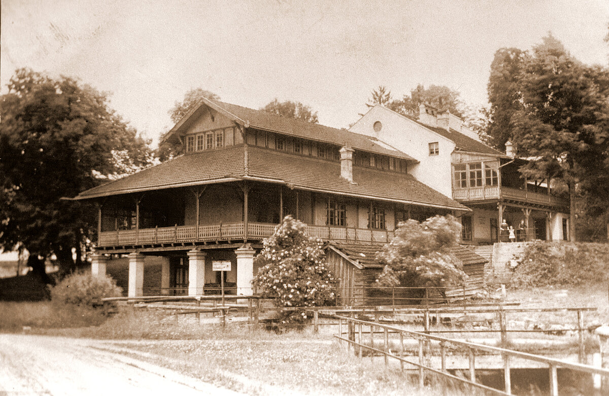 Der Plest-Keller war ein stattlicher Barockbau mit hohem Schopfwalmdach, den Friedrich Wilhelm Doppelmayr Anfang des 19. Jahrhunderts in mehreren Zeichnungen festgehalten hat. Zwar war der Keller ein gutes Wegstück vom Markt Rosenheim entfernt; dafür aber bot sich den Gästen von einer schon 1810 bestehenden Veranda ein weiter Ausblick ins Inntal. Nach der Stilllegung des Plest-Bräus Mitte des 19. Jahrhunderts erlebte der Plest-Keller einen mehrfachen Eigentümerwechsel, bis der Brauereibesitzer Johann Auer das Anwesen in den 1890er Jahren erwarb. Auer ließ das Gasthaus großzügig zu einem der schönsten Bierkeller Rosenheims umbauen.