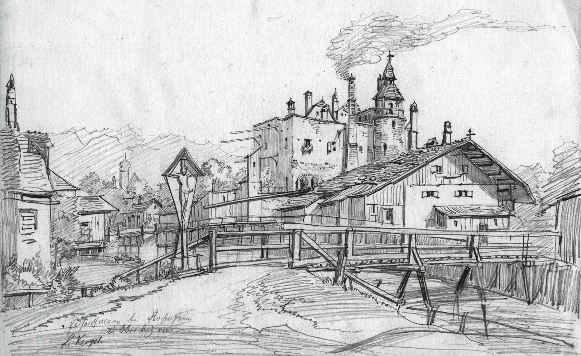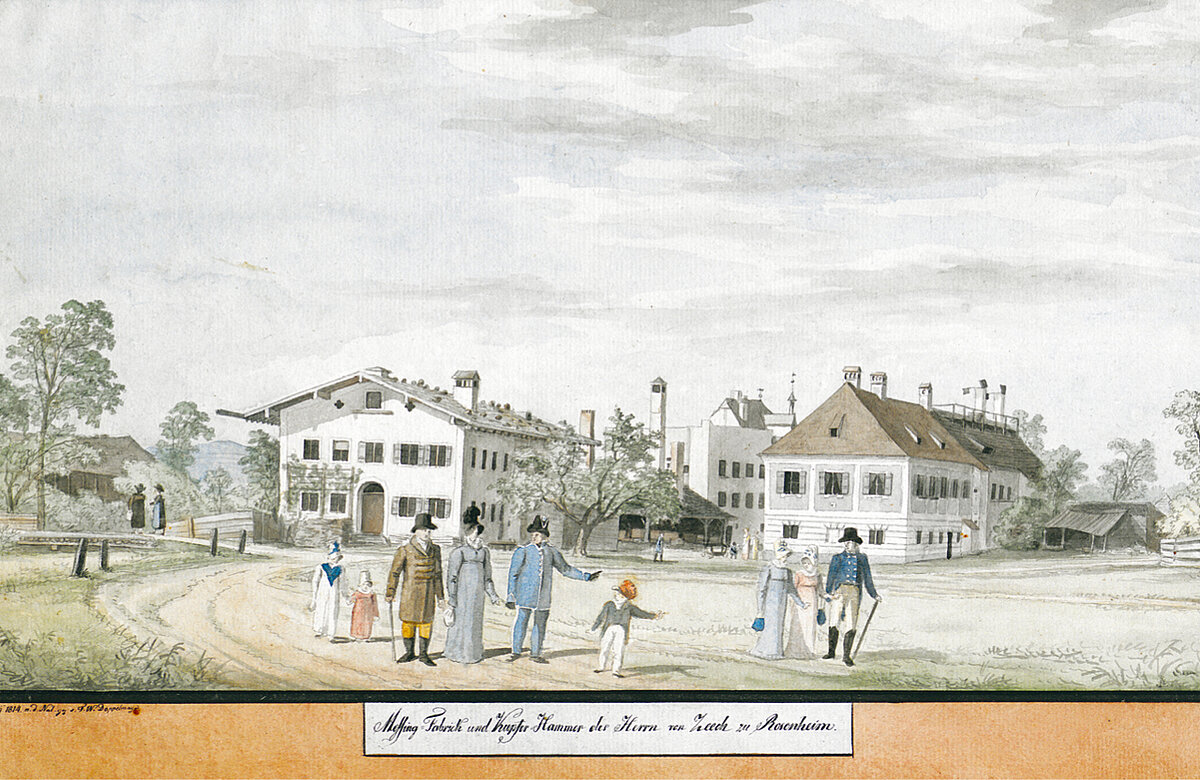 Seit dem 15. Jahrhundert werden vom Hammerbach, einem Seitenarm der Mangfall, verschiedene Mühlen und Hammerwerke angetrieben. An dieser Stelle entsteht im 18. Jahrhundert eine Messinghütte, deren Anlagen 1840 vom Eisenhändler Nikolaus Stumbeck übernommen werden. In der direkten Umgebung siedeln sich weitere Betriebe an: eine Gießerei, eine Fabrik für Soda, Knochenmehl und Salmiak, eine Pulvermühle, eine Kunstmühle, eine Maschinenfabrik sowie eine Waffenschmiede mit Kupferhammer, die ab 1857 in den Besitz der Gebrüder Beilhack gelangt. Die Zeichnung von Ludwig Kergel zeigt den Messinghammer um 1850, im Vordergrund führt die Kufsteiner Straße mit einer Brücke über den Hammerbach. Einen ähnlichen Blickwinkel wählt 36 Jahre vorher Friedrich Doppelmayr von der anderen Seite des Bachs: das Haus links, das zum ehemaligen Messinghammerwerk gehörte, ist heute noch an den rosettenförmigen Öffnungen im Giebel zu erkennen.
