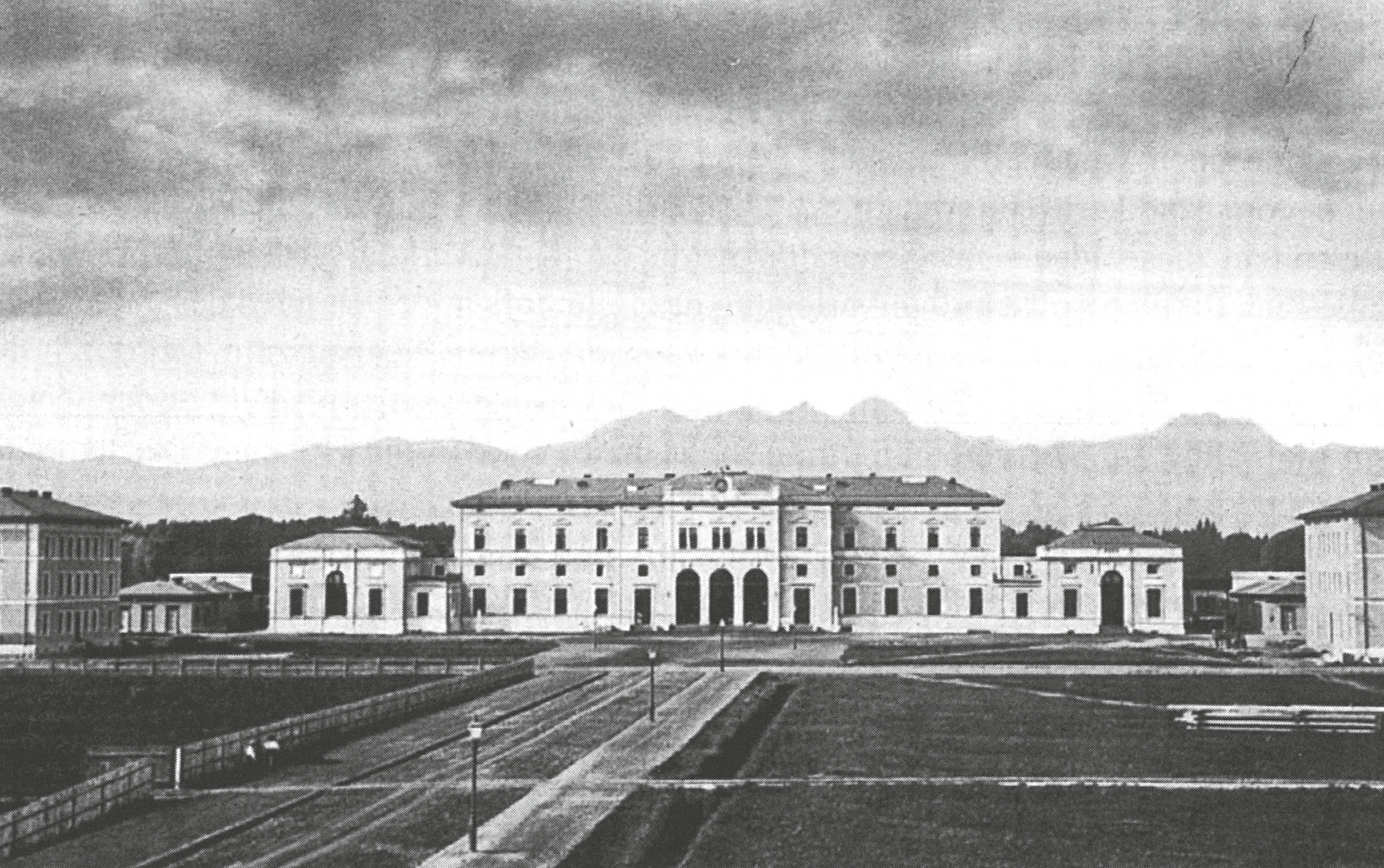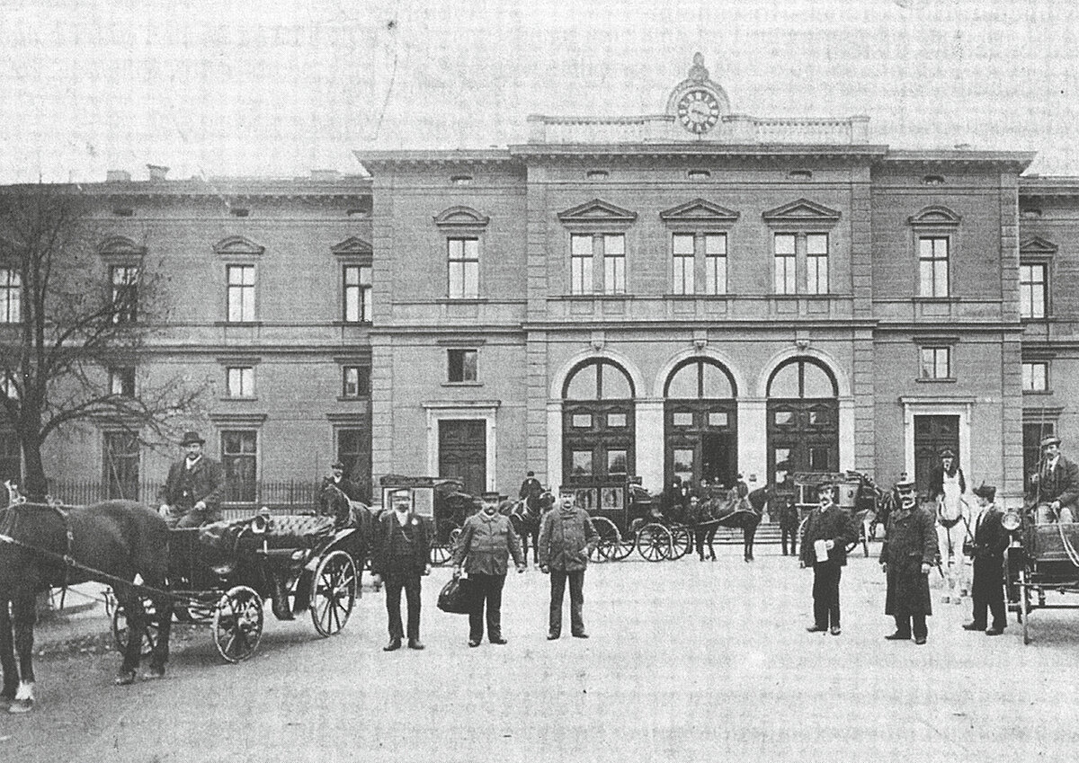 Die Achse der neuen Bahnhofstraße führt direkt auf das symmetrische Bahnhofsgebäude zu. Nach dem Entwurf des Architekten Jakob Graff wurde es 1876 im Neorenaissance-Stil erbaut und löst den ersten Bahnhof an der heutigen Rathausstraße ab. Bevor die Gleise hierher an den Stadtrand verlegt wurden, diente das Baufeld Anfang des 19. Jahrhunderts als ausgedehntes Brennholzlager für die Saline. Später verwendet man Torf zum Befeuern und braucht keine Lagerflächen mehr. Die Straßenverbindung vom Bahnhof zur Stadt wird schon bald geschlossen bebaut und entwickelt sich zu einem belebten Wohn- und Geschäftsviertel. Zusammen mit der Münchener Straße bildet sie die neue »Lebensader« Rosenheims. Nach der Zerstörung im Zweiten Weltkrieg wird das Empfangsgebäude des Bahnhofs von 1952 bis 1957 in seiner jetzigen Form errichtet.