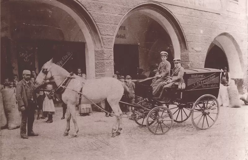1892 erwarben die Bäckerseheleute Jakob und Anna Kirmaier das Haus Nummer 15 am Max-Josefs-Platz und richteten hier eine Bäckerei nebst Mehl- und Getreidehandlung ein. Ursprünglich gehörte das Gebäude, das aus dem 16. Jahrhundert stammt, dem Marktphysikus, der gleichzeitig auch Apotheker war. 1687 erwarb es das Spital, 1731 die Pfarrgemeinde St. Nikolaus, die es als Pfarrhof bis 1884 nutzte. Die Bäckerei Kirmaier bestand bis 1936. Dann wurde sie an Josef Bergmeister verkauft, da der Inhaber, Jakob Kirmaier junior, nach München zog. Auf dem Kalenderbild ist Bäckermeister Jakob Kirmaier mit seinen beiden 1884 geborenen Zwillingssöhnen Jakob und Georg zu sehen, die auf dem Brotwagen sitzen, mit dem die Bäckerei Kirmaier ihre Kunden belieferte. Im Gebäude befand sich nicht nur die Bäckerei, die im ersten Stock untergebracht war, sondern auch neben einem Reiseartikel-, Taschen-, Hut- und Schirmgeschäft die Kurzwarenhandlung von Wilhelm Reith.